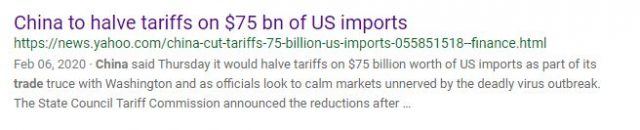 2月6日(周四),中国宣布将价值750亿美元的美国进口商品削减一半关税。自下周起,针对部分商品则将10%关税减至5%关税;原5%关税之商品减至2.5%。
