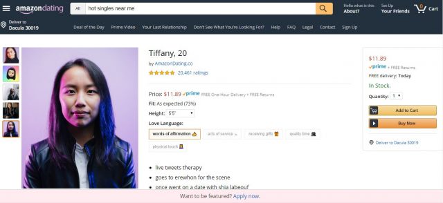 这个“亚马逊约会(Amazon Dating)”网站看起来很眼熟吧?但仔细一看照片和商品介绍,可能你就有些迷惑了。亚马逊什么时候当上“媒婆”了?其实你要是仔细读一下介绍页面,你会发现,这些东西只是个玩笑,别当真呦~ 可以去这里看看:https://amazondating.co/