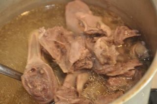 3、将切成小块的鸭肉放入锅中,倒入清水,用温火将水煮沸,去掉水面的泡沫,然后,把姜、葱、盐、料酒一起倒入锅中,慢慢炖约四十分钟。
