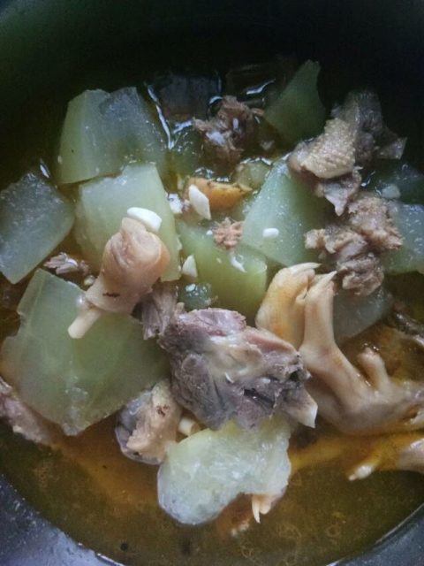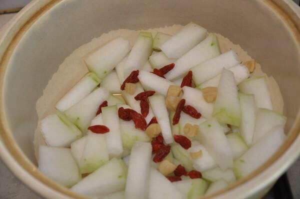 4、待鸭肉炖至八成熟的时候,加入冬瓜、枸杞,继续用温火炖,直到冬瓜变软即可。