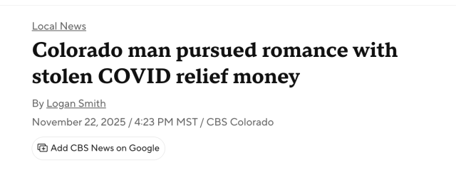 在美国科罗拉多州阿克伦市,63岁的威廉·查德威克(William Chadwick)或许从未想过,自己精心策划的骗局竟会以另一种骗局告终。疫情期间,他通过伪造材料诈领联邦救助金,却将赃款悉数“奉献”给一名素未谋面的网恋对象——而对方,竟是一名职业诈骗犯。
