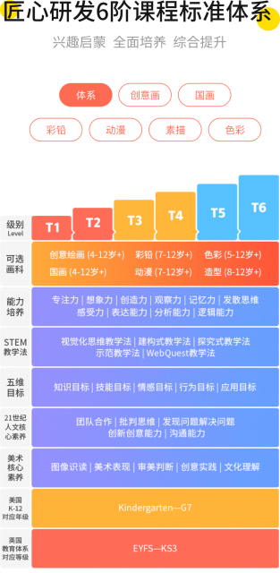 课程以美术宝独有的ART CLASS在线直播技术为授课平台,共包含六大经典科目:创意绘画(含线描)、油画、国画、动漫、彩铅、素描(含速写),每个经典画科从易到难包含6个级别,每个级别为48节全年课包,每个课包含6个单元,每单元设置为8节课。整套体系满足4-12岁适龄儿童不同难度不同需求。