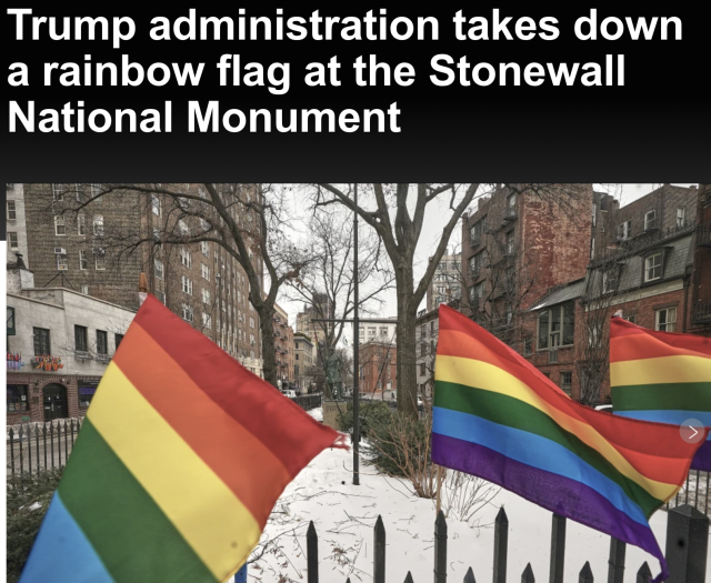 2025年2月,国家公园管理局删除了石墙纪念碑官网中有关跨性别者和酷儿群体的表述。特朗普在第二任期初发布行政命令,要求联邦政府只承认男性和女性两种性别。此后,多个联邦机构将“LGBTQ+”缩写简化为“LGB”,并移除与跨性别者及非二元群体相关的网页内容和数据。