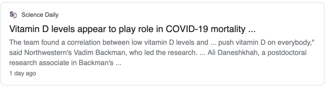 研究人员还发现维生素D水平与细胞因子风暴之间有很强的相关性,这是免疫系统过度活跃导致的一种高炎症状态。