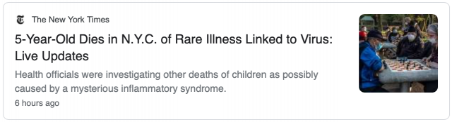 4. 库默表示,有证据表明新冠病毒可能会导致某种针对儿童的严重疾病。纽约目前已报告73例类似于川崎病和类似中毒性休克综合症的病例。本周四,纽约市一名5岁男童因并发症不幸去世,目前还在调查中。