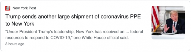 据纽约邮报报道,白宫消息人士说,周五(5月8日)发送的这批物资包括100万双手套、20万只口罩、19万4千件防护衣、1万8千个防护眼罩,纽约州卫生部门将决定分发到哪些地方。
