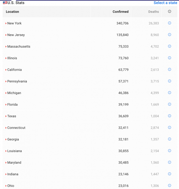 其中纽约州累计确诊340706例,死亡26383例;新泽西州累计确诊病例135840例,死亡8960例;康涅狄格州累计确诊病例32411例,死亡2874例;宾夕法尼亚州累计确诊病例57371例,死亡3715例。