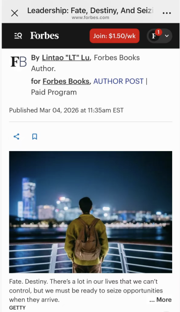 在福布斯图书重磅推出的励志回忆录《从窗户爬进去》中,美国华裔企业家卢林涛博士(Lintao Lu)用自己真实的人生轨迹给出了答案。作为一位从中国偏远农村走出、最终执掌全球《财富》500强企业的领导者,卢林涛博士并未将成功粉饰为一路坦途的传奇。相反,他在福布斯专栏中深刻剖析了领导力的本质:它不是单一的天赋或努力,而是命运、品格与关键时刻果断“跃出”的复杂交织。