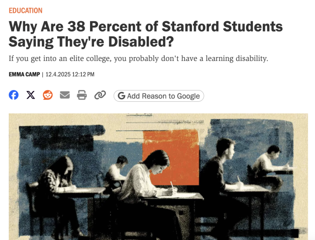 2025年秋季学期,斯坦福大学的校园统计数据引发了广泛讨论:该校38%的本科生正式注册为“残疾学生”,这一比例已达到十年前的四倍。这些被官方认定的残疾学生,绝大多数并非传统意义上的身体残障者,而是以注意力缺陷多动障碍、焦虑症、抑郁症等精神健康状况为由,获得了包括额外50%的考试时间、低干扰考场环境,甚至单人宿舍在内的多种便利条件。