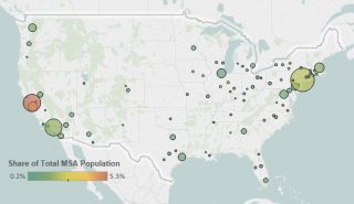 截至2011年至2015年,纽约、旧金山和洛杉矶是中国移民人数最多的美国大都市地区。这三大都会地区约有44%的中国移民。