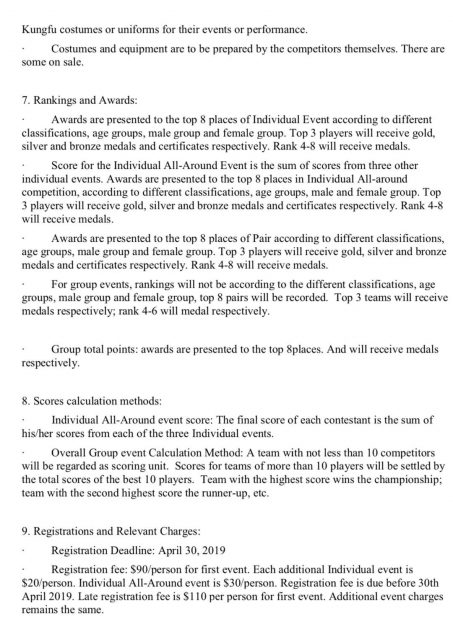 (二) 报名参赛费:每位美金 90 元(包括任何一项的参赛费和报名费)。每增加一项交超报 项目费美金 20 元(包括集体)。参加全能比賽者須另交美金 30 元。报名缴费时间为 2019 年 4 月 30 日之前。2019 年 4 月 30 日之后报名者,每位报名参赛费美金 110 元。
