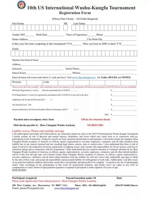 (六) 如果需要逾期报名或改动报名项目,则必须向组委会递交书面申请,在组委会同意后方可补报和改动。每改动一项或补报一人需要额外交付美元$25。