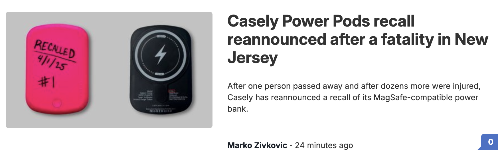 在接到多起起火、爆炸报告以及一宗致死案例后,近 43 万个无线手机充电宝被再次紧急召回。美国消费者产品安全委员会(CPSC)于 4 月 16 日宣布,此次召回涉及约 429,200 个 Casely Power Pods 5000mAh 便携式 MagSafe 无线充电宝。
