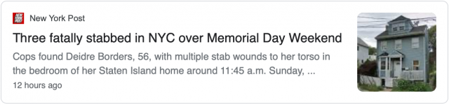 据侨报纽约网报道,纽约警察局5月25日周一表示,国殇日周末期间,有三人在12小时内被刺死。