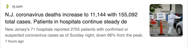 截至周日晚间,新泽西州71家医院报告了2,755例确诊或疑似病例,较4月14日的峰值下降66%,当时有8,084名患者接受治疗。截至周日晚间,全州有719名重症或重症监护患者,其中540人使用呼吸机。