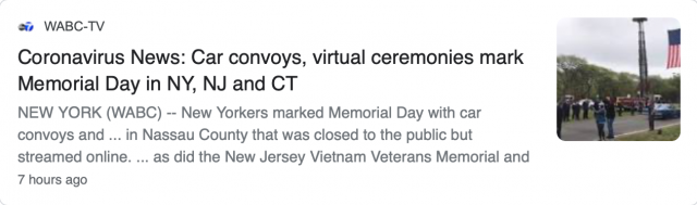 据美国广播公司报道,每年在无畏号上的敬献花圈仪式今年将通过虚拟形式举行。新泽西州西法克郡的林地公园在其脸书页面上举行了虚拟的纪念仪式。上午11点,新泽西州越战老兵纪念碑和越战时代博物馆将在其脸书和Instagram页面上直播一场纪念仪式。