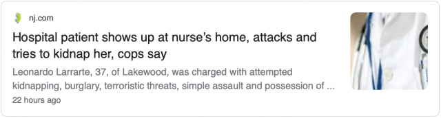 据侨报纽约网报道,警方称,一名新泽西男子试图绑架一名护士。一天前,这名护士才刚刚在一家医院照顾他。