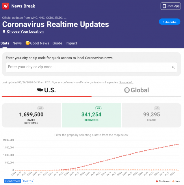 据News Break报道,根据WHO、NHC、CCDC、ECDC等官方数据,截止美国东部时间5月26日凌晨4:51,美国新冠累计确诊1699500例,死亡99395例,康复341254例。
