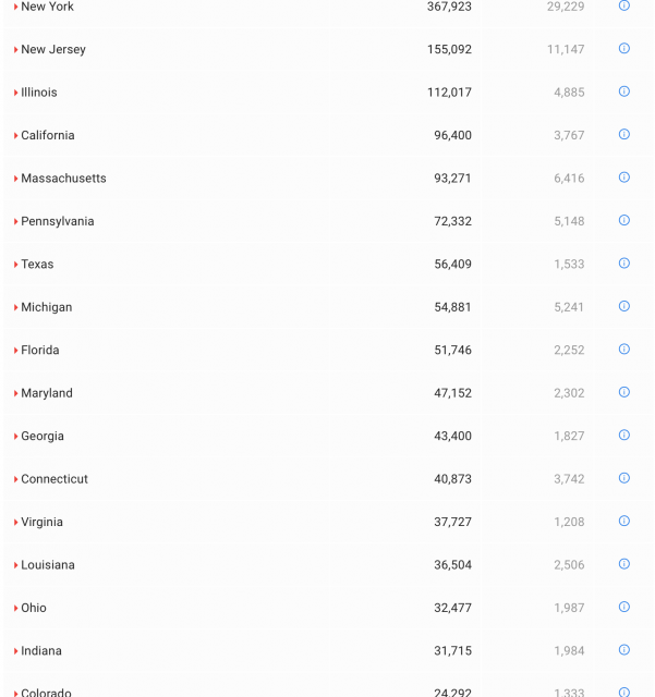 其中纽约州累计确诊367923例,死亡29229例;新泽西州累计确诊病例155092例,死亡11147例;康涅狄格州累计确诊病例40873例,死亡3742例;宾夕法尼亚州累计确诊病例71925例,死亡5146例。