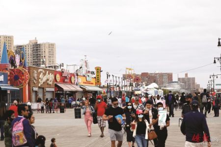 国殇日长周末期间,为有效避免民众过度聚集而可能导致的病毒传播,纽约市的海滩均被禁止全面开放。尽管如此,5月24日布碌仑康尼岛海滩木板路上仍然汇聚了来自全市各地的大批游人。为有效落实社交距离规定,避免民众过度聚集,市警察局于海滩处增派了巡逻警力,切实监督游人遵守社交规定的情况。