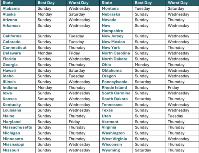 GasBuddy 基于过去一年各州每日平均油价数据进行标准化分析,排除季节性因素后发现,油价存在稳定的“周周期规律”。在纽约这种规律十分清晰: