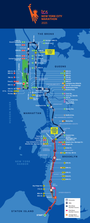 比赛将于周日上午8点开始,选手们将从史坦顿岛出发,依次穿越布鲁克林、皇后区、布朗士区和曼哈顿,最终抵达中央公园终点线。起跑将分批次进行,从男子与女子职业轮椅组开始,最后一组大众跑者预计在上午11点30分出发。
