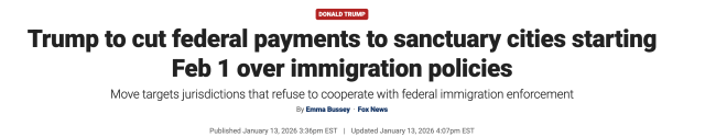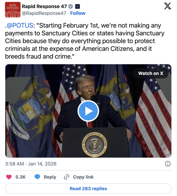 美国总统唐纳德·特朗普周二公开表示,他计划自 2月1日起停止向庇护城市以及实行庇护政策的州提供联邦资金。此举被视为对拒绝与联邦移民执法机构合作的地方政府施压,相关削减金额可能高达数十亿美元。