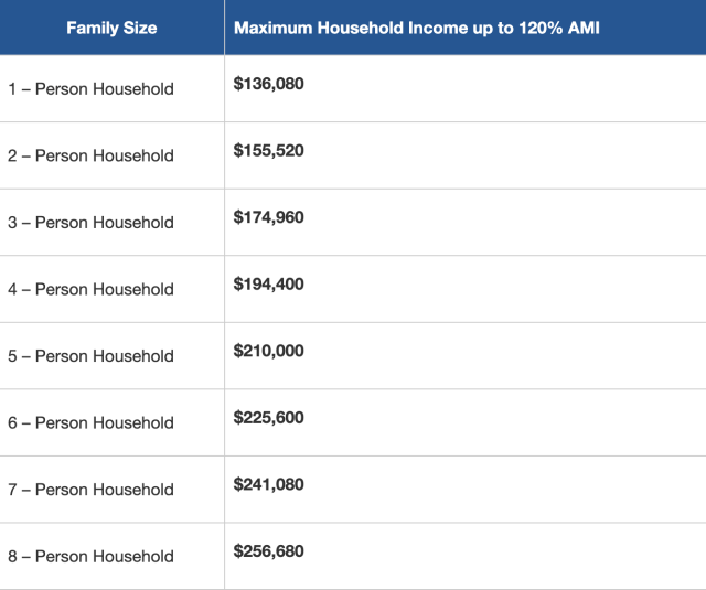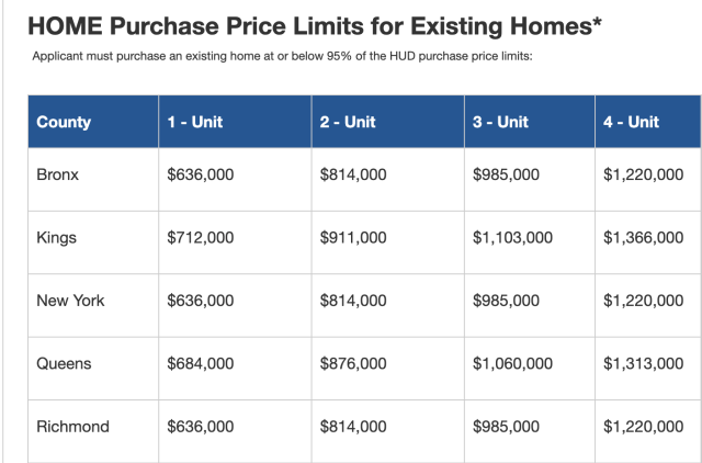 在纽约市五个行政区购房收入限制(基于地区中位收入的80%)。