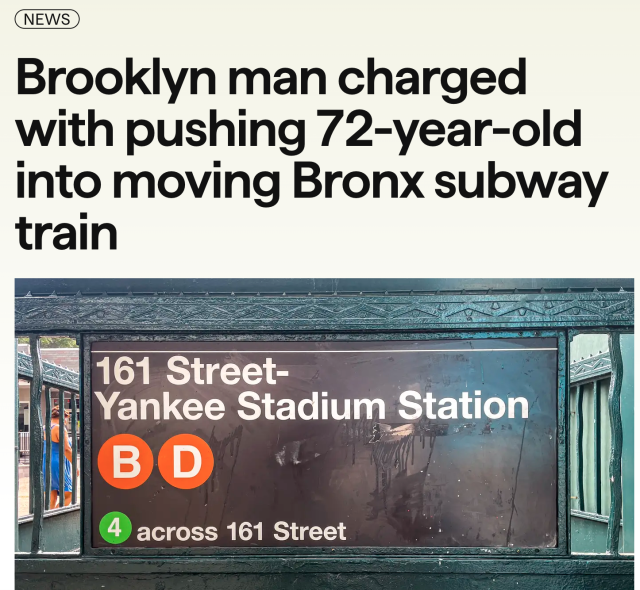 据纽约警方和检方披露,元旦当天凌晨约3点30分,一名72岁的老人正在布朗克斯区161街—洋基体育场站站台上,等待开往曼哈顿方向的4号线地铁。就在列车驶入站台的瞬间,一名陌生男子突然从背后发力,将老人猛地推向列车侧面。