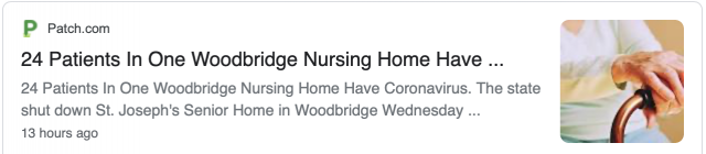 据Patch报道,新泽西州 Woodbridge一家长期养老院中24位人新冠病毒检测呈阳性,之后该养老院完全关闭。