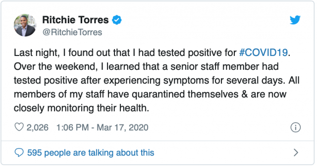 纽约市议员托雷斯在周二(3月17日)被确诊感染新型冠状病毒肺炎,目前在家自我隔离。