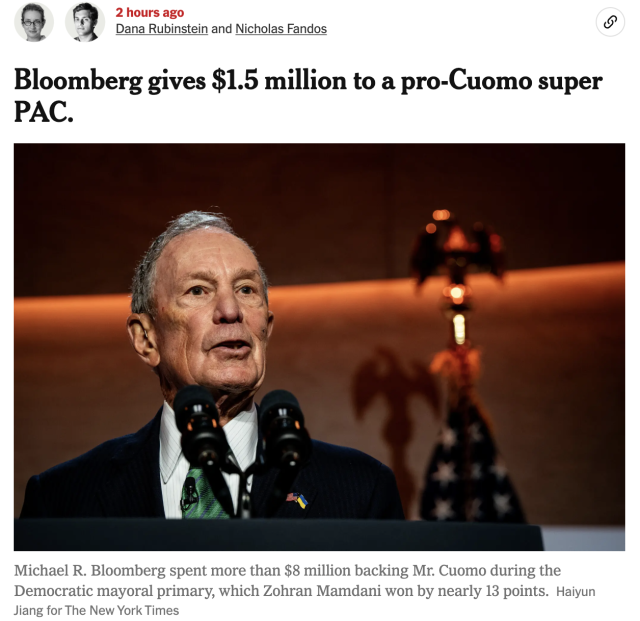 前市长迈克尔·布隆伯格近期向支持安德鲁·葛谟的超级PAC“修复城市”捐赠150万美元,用于反曼达尼宣传。布隆伯格虽曾在9月与曼达尼会面并评价其“聪明、积极”,但最终公开支持葛谟,称其“拥有应对纽约挑战的经验与意志”。这是布隆伯格自民主党初选以来首次涉足市长竞选。曾任三届市长的中间派布隆伯格一直持观望态度。