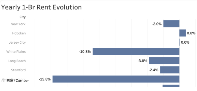 不过,如果你愿意把目光投向城市之外,纽约都会区仍存在一些“喘息空间”。根据租房平台Zumper最新发布的报告,在对纽约都会区活跃房源的分析中,纽约市依然稳居租金榜首,但周边多个城市租金明显回落,部分地区同比降幅高达 15.8%,为被高房租“挤出”纽约的租客提供了新的选择。