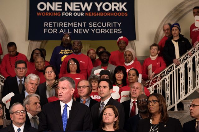 此法案由市议员卡洛斯(Ben Kallos)和米勒(Daneek Miller)提出,得到市长白思豪支持。白思豪23日出席美国退休人员协会(AARP)组织的集会,希望纽约成为全国第一个创建全民退休储蓄计划的城市。当天,市议会就此法案举行首次听证会。