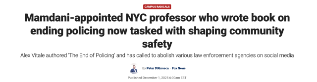 维塔莱是布鲁克林学院的社会学教授,也是2017年出版的《警务的终结(The End of Policing)》一书的作者。他在社交媒体X上宣布:“我很高兴地宣布,我受邀加入曼达尼过渡团队,负责社区安全问题。纽约市的新时代开始了。”