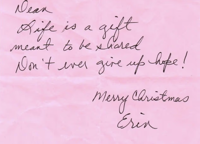 “迪恩,生命是一份应该分享的礼物。永远不要放弃希望!圣诞快乐,艾琳。”