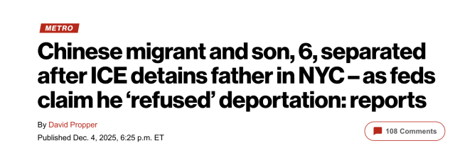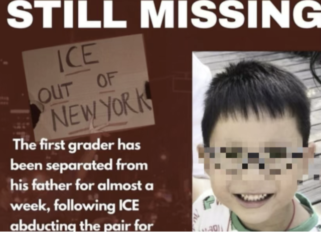 “ICE在一次例行检查后逮捕并强行拆散了一对父子。六岁的郑元鑫刚刚在阿斯托利亚的一所小学入学一年级,”曼达尼在社交平台上写道,“现在他被单独关押,移民局拒绝透露地点。这种残忍做法必须停止。”