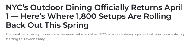 对于食客来说,这一政策意味着熟悉的街头用餐场景将再次回归。像下东区、阿斯托利亚以及布鲁克林市中心等热门街区,预计将出现大量户外餐桌,适合早午餐、晚餐乃至春季约会。
