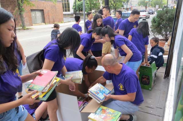这22箱书籍于八月三十一日被几位狮友载往泽西市(Jersey City )的船运公司。当日早晨,九位狮会成员及十四位青少狮齐集公司门前的人行道,把载来的九百多本书重新装入该公司统一货运的四大厚纸箱内。由青少狮们封箱标籤寄件和收件人地址,然后狮会支付运费,就此完成了今年的捐书任务。这些书本预计在十一月中旬抵达目的地。