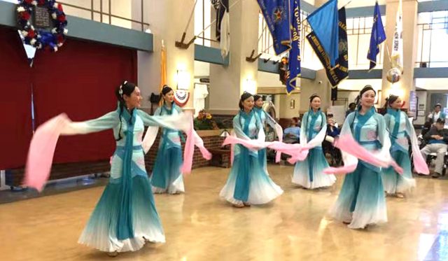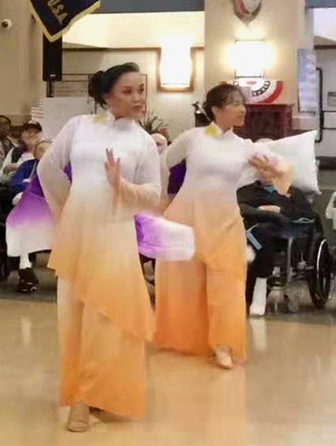 另外,狮会很荣幸能请到杨青舞蹈工作室的成人舞者七人,她们表演了民族舞“采薇”和 旗袍舞“缘”。总结她们这次来表演的感言:“看到坐轮椅的老兵们,心裡很感动,在等场前眼泪汪汪忍不住,下场后和他们握手聊天,他们连说我们好美好美。让我们觉得跳舞除了自己享受,更有意义的是给老人家带来欢乐。”