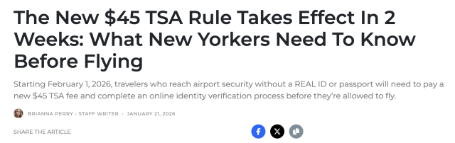 从 2026 年 2 月 1 日 起,美国运输安全管理局(TSA)一项新的规定将正式生效:年满 18 岁、未携带 REAL ID 或护照的旅客,在机场安检时必须支付 45 美元,并通过一个新的在线身份验证流程,才有可能被允许登机。这意味着,过去那种“证件不合规也能靠人工核实放行”的宽松做法,将彻底结束。