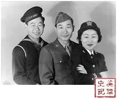 ——一个韩裔家庭:Susan Ahn(安绣山)1915年生于洛杉矶。她的父亲安昌浩是日本占领时代的韩国独立运动领袖,被称为“韩民族独立之父” 。 Susan Ahn和两位参军的兄弟,摄于1942年