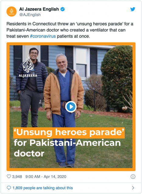 萨乌德・安瓦尔医生发明了一种新式呼吸机,可以同时供7名新冠肺炎患者使用。在当下疫情严峻的时刻,美国很多医院呼吸机短缺,这种发明对生命无疑具有不可估量的意义。更让人感动的是,这位医生把自己的发明无偿贡献给人类社会,没有赚一分钱。