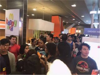 当地时间10月7日下午1点45分,在纽约麦当劳店一位美国少年激动地大喊:“(四川辣酱)已经没有了!”但很多人都没有听到这个消息,因为店里店外都挤满了人,他们都希望得到哪怕是《瑞克和莫蒂》四川辣酱海报或者是一小袋酱料。即使人们已经知道每个店仅有10张海报、20到40包酱料,仍然有越来越多的人挤入拥挤的队伍中,希望得到他们自己的那份四川辣酱。