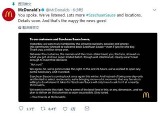 随后麦当劳不得不出来发表道歉声明,称没有意识到辣酱如此受欢迎,预计今年冬天在全美所有的餐厅再次推出“四川辣酱”,并且承诺不会只卖一天。
