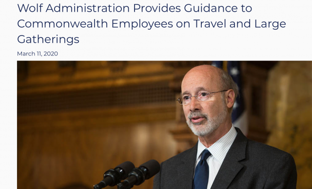随着大学转向在线教学,宾夕法尼亚州立大学鼓励其主校区和21个卫星校区的76,000名学生在接下来的三个星期内留在家里,而宾州大学和匹兹堡大学希望学生在本学期回家。州长Tom Wolf采取了限制旅行和聚会的措施。