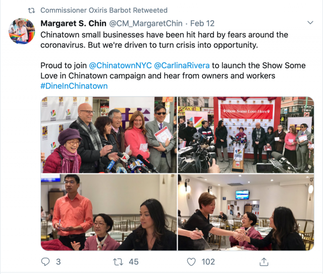 纽约市卫生局长Oxiris Barbot上周四曾发表推文并配图称,自己在曼哈顿华埠享用午餐。她说:“我对最近一些针对亚洲社区的偏见和歧视性的新闻报道感到沮丧。我要再次声明——我们的公共卫生应对措施是针对一种病毒,而不是针对一群人。”