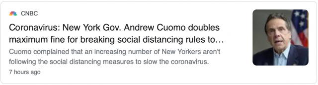 5. 库默谴责在刚刚过去的这个周六外出休闲的纽约民众,他表示,这样的行为是极不负责的,他理解纽约民众在家关久了想要出门的心情,但是目前还不是时候。库默要求地方政府严格执行“社交距离”规定,并宣布将罚款从500元升至1000元。