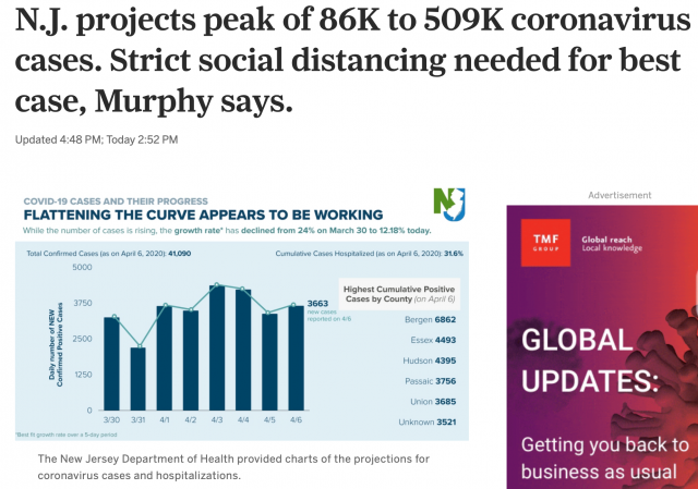 截止周一(4月6日)下午1点,新泽西州新型冠状病毒肺炎疫情统计如下: