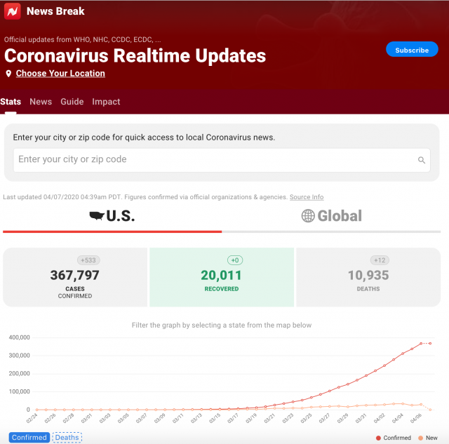 据News Break报道,根据WHO、NHC、CCDC、ECDC等官方数据,截止美国东部时间4月7日凌晨4:39,美国新冠累计确诊367797例,死亡10935例,康复20011例。